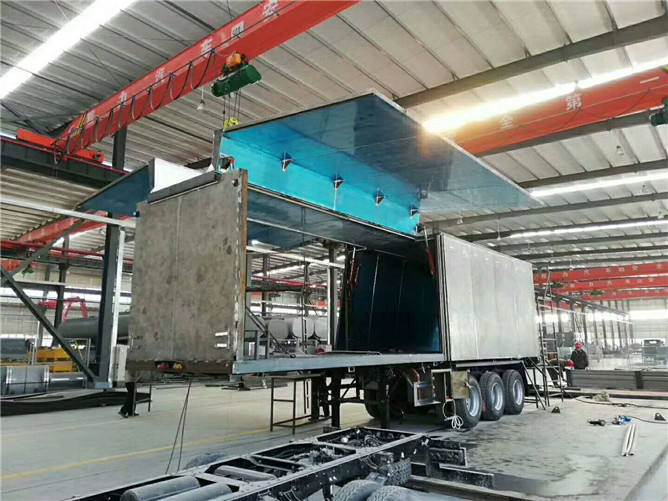 廂體生產工藝采用可產生靜電屏蔽效應通風防雨的冷扎透氣鋼板,中間附以B1級阻燃擠塑板,內飾鋁合金板,廂內四周內飾采用鋁合金角鋁型材壓邊。廂內安裝固定運載物的臥環(huán),防燃煙霧報警器,門上安裝防盜報警器,前置安裝防撞防靜電膠皮。廂體門框采用三元乙丙一次成形橡膠密封條,底部為防爆鋼板上鋪靜電膠板。