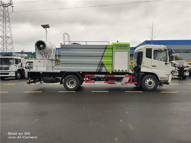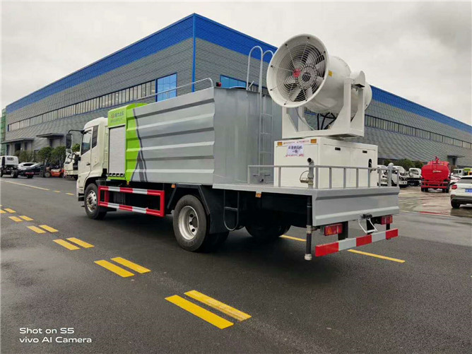 12立方東風多利卡D9抑塵車,環保免征齊全,搭載玉柴200馬力/康機210馬力發動機,水罐溶積12立方,大平臺最高可裝100米車載專用霧炮,整車不超重。