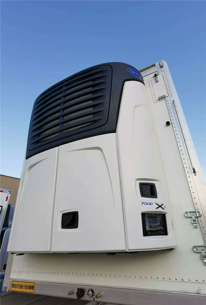 13.6米冷藏半掛車搭配13噸富華后橋,日上鍛造鋁圈,全覆蓋鋁合金擋泥板,鋁合金側防護,約斯特雙聯動支腿,前后通風器,鋁合金通風槽 ,30CM鋁合金擋板,帶鋁合金前擋板,通風布,美國開利大鳳凰X4/7300的-18度冷機,帶爬梯,單側門,自重8.5噸。