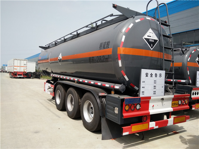 28.2立方稀硫酸半掛車采用Q235板材制作,筒體厚度4.2mm,封頭厚度4.75mm,襯塑16mm,兩個進料口,后尾部左右自流配3寸PP球閥,鋁合金附件,一個工具箱,一個備胎架,1200真空胎(鋁合金鋼圈)。