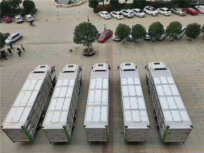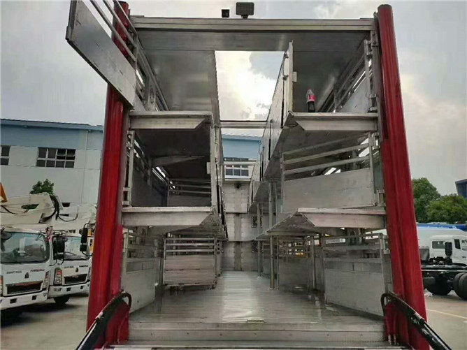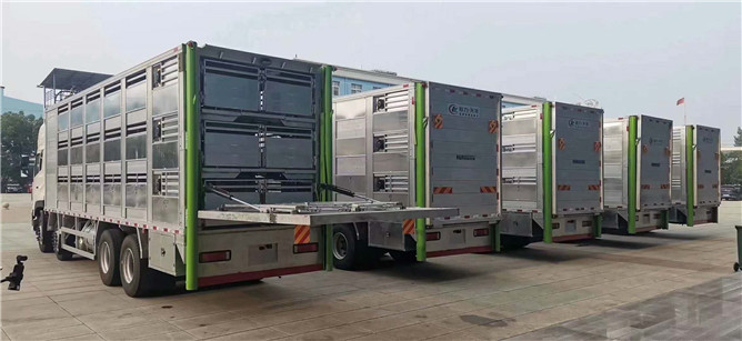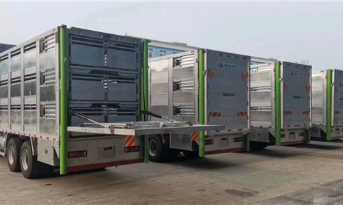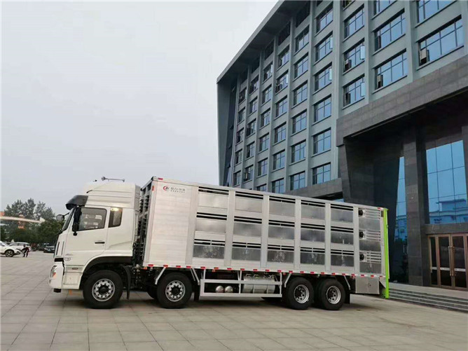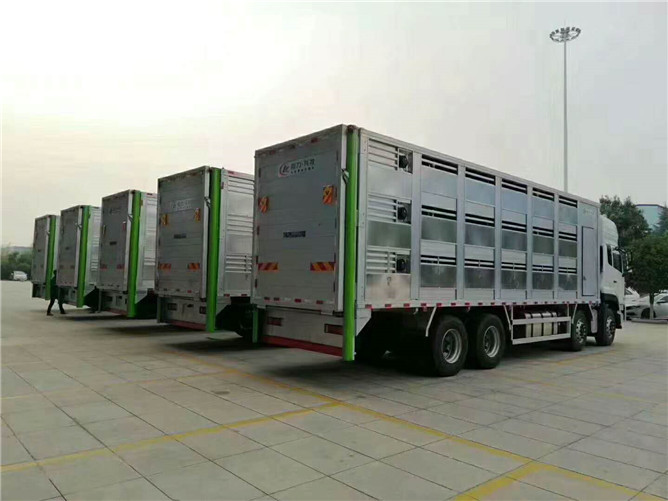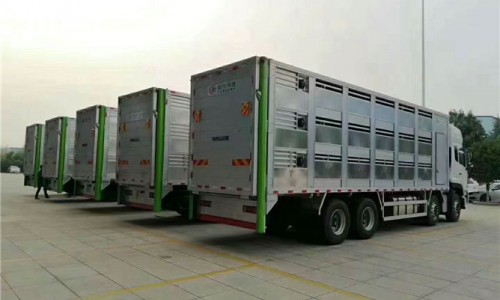 畜禽運輸車箱體采用全鋁合金制作,主要規格有東風天錦全鋁合金運豬車(三層成豬70~75頭,四層幼豬750~800頭)和東風天龍前四后八全鋁合金運豬車(三層成豬110~120頭,四層幼豬1200~1250頭)。該種車型標配噴淋、喂食、監控、混合隔倉、垂直升降尾板、保溫機組,減少臟亂差,細菌飛散,保護環境,增加成活率。