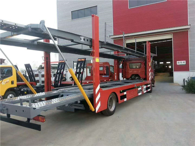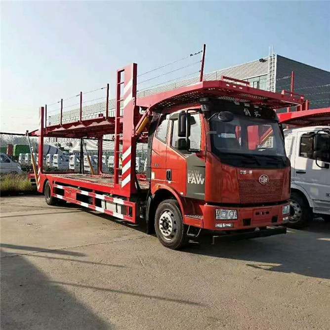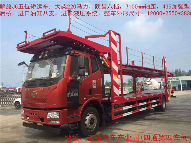 解放J6轎運車搭載大柴220馬力發動機,四缸機,陜齒八檔,7100軸距,435加強型后橋,上裝標配凈板長12米,下板凈長9.8米,全車標配8支進口油缸,上裝全低合金高強材料制作。