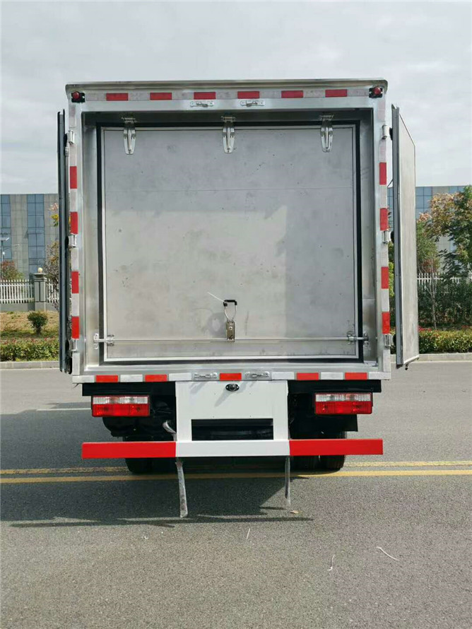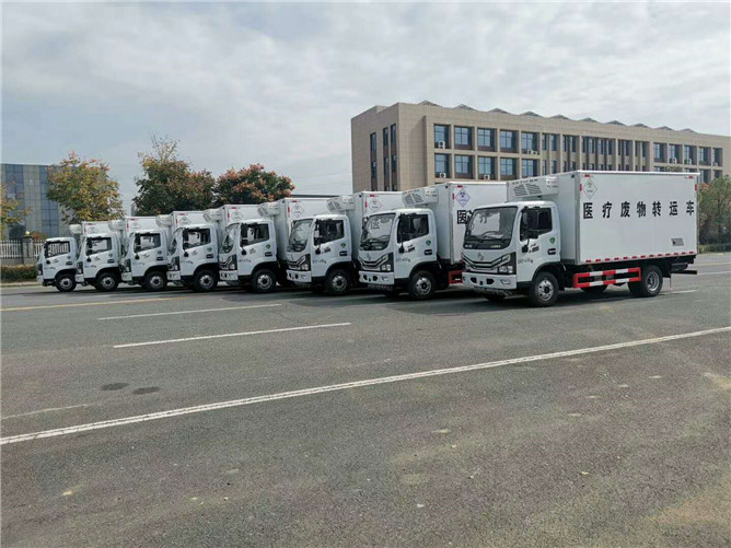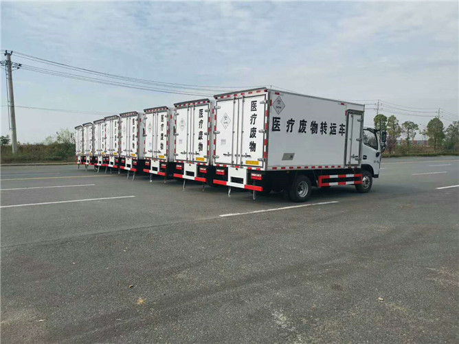 該車(chē)采用東風(fēng)多利卡D6柴油平頭醫(yī)療廢物廂式運(yùn)輸車(chē),朝柴發(fā)動(dòng)機(jī)130馬力國(guó)六排放標(biāo)準(zhǔn),帶方向助力,6檔變速箱700綱絲胎,氣剎帶前盤(pán)式剎車(chē),ABS,限速裝置,廂體采用外飾玻璃綱內(nèi)飾不銹鋼中間4公分保溫層制作,廂內(nèi)頂部安裝紫外線滅菌燈,配電動(dòng)噴霧消毒桶一個(gè),安裝零下零度至零下5度冷藏機(jī)組。
