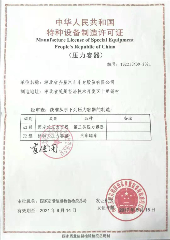 液化氣地埋罐屬于三類(lèi)固定式壓力容器,生產(chǎn)廠家須取得特種設(shè)備生產(chǎn)制造許可證方才能夠進(jìn)行生產(chǎn)作業(yè)。以下為我公司生產(chǎn)資質(zhì)。