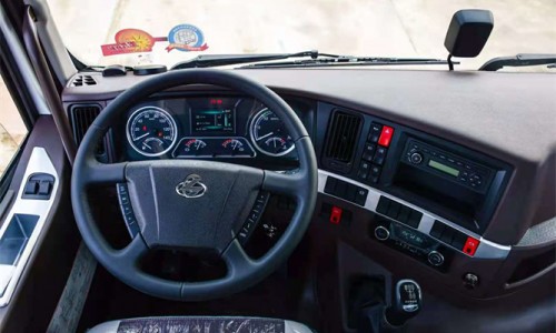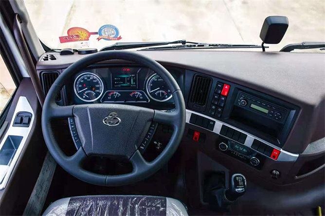 其它配置:液壓機(jī)械翻轉(zhuǎn)、機(jī)械減震司機(jī)座椅、自動空調(diào)、定速巡航系統(tǒng)、ABS、車載終端、中控鎖、自動調(diào)整臂、多態(tài)開關(guān)、真皮多功能方向盤、前置排氣管、前輪防爆胎裝置、盤式前橋、排氣火花熄滅器、ECU限速裝置(限速80km/h)、駕駛室電源總開關(guān)、導(dǎo)靜電橡膠拖地帶。