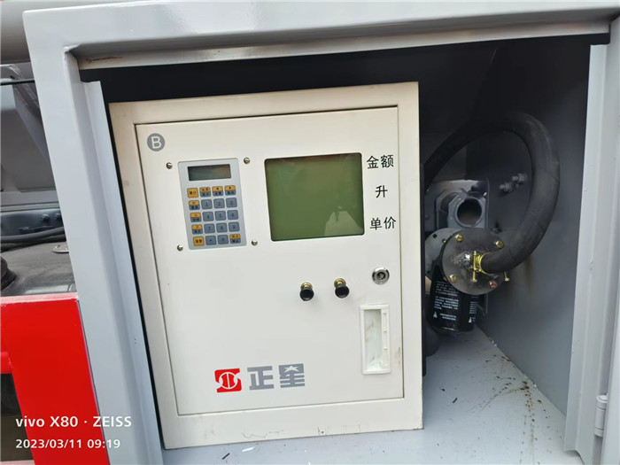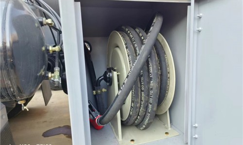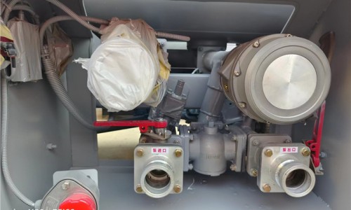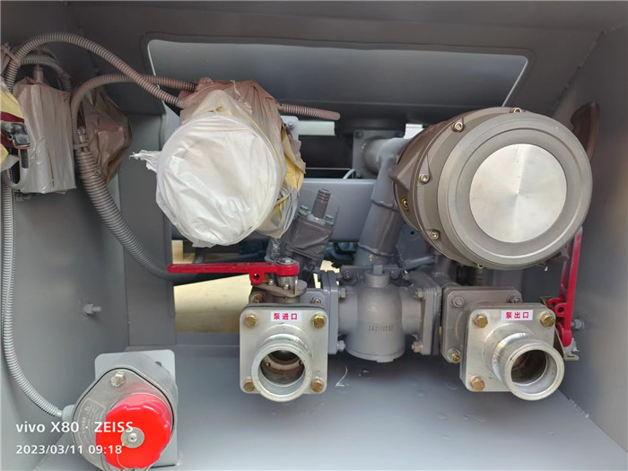 該加油車配置通倉帶歐標全套下裝油系統(含1個下裝卸油閥、1個油氣回收閥、1個油氣回收接口、1套氣動組合開關、1個防溢流探桿和1個插座),一只歐標罐蓋,一個海底閥,罐體頂部兩側帶折疊升降防護欄,標配顏色灰色,罐體兩側正中貼3M-1級橙色反光帶,貼三個“易燃液體”標識,安全告示牌。