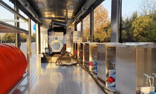 廂體部分:采用一體化鋼體結構設計廂體,具備運輸、防雨、防火、阻燃、防塵、防銹、降噪、隔震等功能。移動電源系統匹配東風康明斯250kw發電機組及智能控制系統,并可對外輸出220V/380V電壓。搭載8臺便攜式軸流潛水泵,單臺排量500立方/小時。4套一拖二水泵控制系統,可視化操作界面,實施監測運行數據。4套液壓支撐系統,單套靜載荷6噸。車頂升降照明燈一套,遙控距離25米,升降高度2.5米。野外休息室一套,配備頂部空調、長形座椅、工作臺、飲水機等生活保障設備。