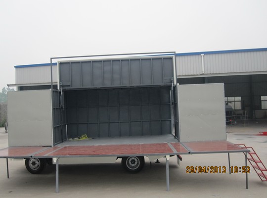 裝駕駛室空調和方向助力。 側面展開為:1車廂頂部半掀開,側廂體放下作為舞臺板,2邊廂和車廂頂部二分之一同掀起 ,內藏式舞臺板(可選擇) 兩面展開為:左右廂體升起隨液壓缸升至1.3----1.5米左右,內藏式舞臺板,液壓展開. 三面展開 為: 左右廂體升起隨液壓缸升至1.3----1.5米左右,左右內藏式舞臺板,液壓展開,后門和雨延自動放下和伸出(作為遮陽和防雨) 整 車為全液壓操作,安全可靠,操作簡便,維護省心,只需十分鐘,就可完成全部搭臺布景工作,省力省心看得見,是各個劇團的好幫手。 | |||