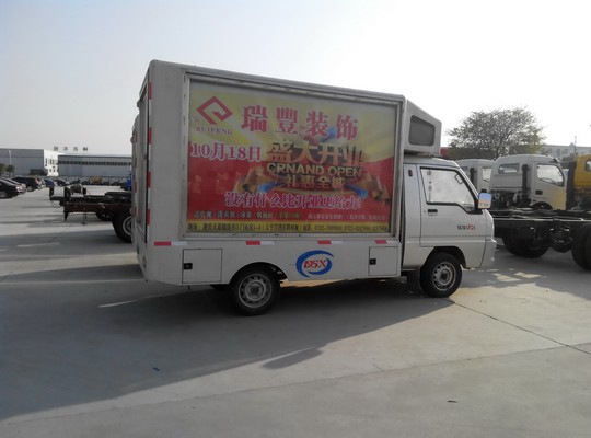 福田馭菱 小型滾軸燈箱廣告車簡介: 福田馭菱小型滾軸燈箱廣告車。選用福田原廠馭菱底盤改裝,該車軸距為2370mm 選用柳州五菱61匹馬 力發動機 。駕駛室美觀高端大氣,燃油種類為:汽油油 排放標準為:國三。 該款滾軸燈箱廣告車整車尺寸為:4410X1700X2750 (mm) 廂體內尺寸為:xx(mm)。整車標準配置為豪華鋁合金內飾、380V50米外接電源線,整車均為滾軸燈箱所包裹,廂體前側可加單紅色 條屏可連續翻滾六副廣告。另該車可接市電220V。 我公司所研發生產的各類LED廣告車,均采用國際先進生產工藝,外形美觀,經久耐用。配 備國內知名品牌歐瑪發電機,及高清高配置LED顯示屏幕。畫質清晰、經久耐用。 客戶可選裝前側單色紅色條屏,雙面彩屏、三面全彩屏,液 壓伸展舞臺、液壓舉升等非標準配置。 產品用途: 廣泛用于企事業單位的宣傳、產品 推廣、品牌推廣,現場展示,體育賽事、演唱會、音樂會及選秀活動。也可在繁華商業區、廣場、居民小區、廣場公園等區域與觀眾或消費者進行現 場展示、交流、互動,宣傳范圍廣泛,可使客戶獲得最大的廣告傳播效果。 | |||