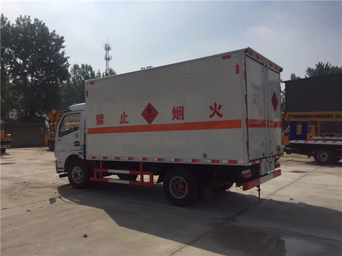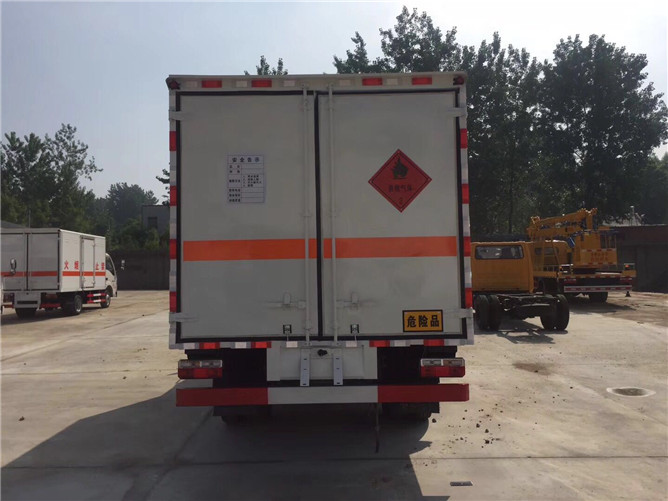 我公司生產的氣瓶運輸車廂體為雙層金屬結構,廂體尾部雙開門,外板采用靜電屏蔽冷軋鋼板,中間填充B1級阻燃泡沫,內飾為鋁板。廂體上側安裝防雨通風透氣孔。底板為花紋板,上鋪防靜電膠皮,廂內兩側加裝固定貨物臥環,門框帶防盜報警器,頂部帶氣味報警器,底盤上裝有兩條拖地導靜電膠帶,廂體外側安裝示廓標記燈以及手提滅火器等安全裝置(選裝隔板、側門)。