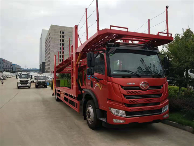解放五位轎車運輸車采用一汽解放的二類運輸車底盤,龍V平頂平浮駕駛室,軸距7200mm,陜齒8檔變速箱,后橋435沖悍橋;錫柴六缸220馬力發動機,295/60R22.5輪胎,空調,空氣彈簧座椅,電動門窗,電動舉升,200L鋁合金油箱(雙油箱),中控鎖,ABS,行車記錄儀,博世尿素系統。全車高配10支油缸。