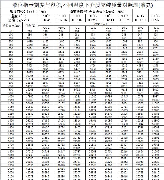 上表可以看出,是以每50毫米為單位的各液位高度對應的液氨儲罐內液體的重量,且零下20度至50度,不同溫度對應的重量也不一樣。且此50立方液氨儲罐直徑為2600毫米,是最優的一種規格。
