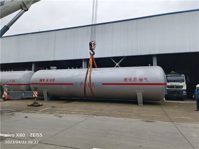 吊裝作業人員將兩根吊帶放置液化氣儲罐中間位置,經過一番試吊,確認安全后緩緩吊起,遂安排貨車司機倒車至指定位置,順利卸載至平板車,整個過程一氣呵成。 據悉,100立方液化氣儲罐設計壓力為1.77MPa,直徑為3100毫米,采用Q345R材質,筒體厚度16毫米,封頭厚度18毫米,可以裝載40噸;60立方二甲醚儲罐設計壓力為1.15MPa,直徑同樣是3100毫米,總長為8.5米。兩臺儲罐均用于貯存輪胎裂解氣體,經過工藝技術分解后,兩道工序下的氣體壓力也不一樣,定購的兩臺儲罐正好能夠物盡其用。