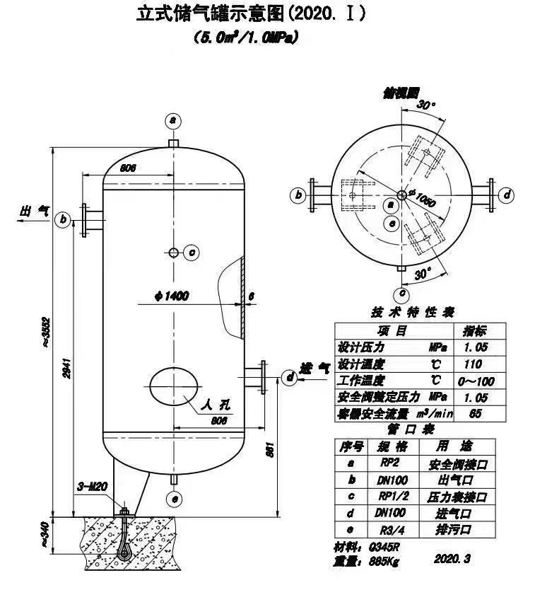 空氣儲罐多設計成立式結構,便于安裝使用,現(xiàn)介紹5立方立式空氣儲罐,它采用Q345R材質(zhì)制作,總重885kg,其它參數(shù)如下: