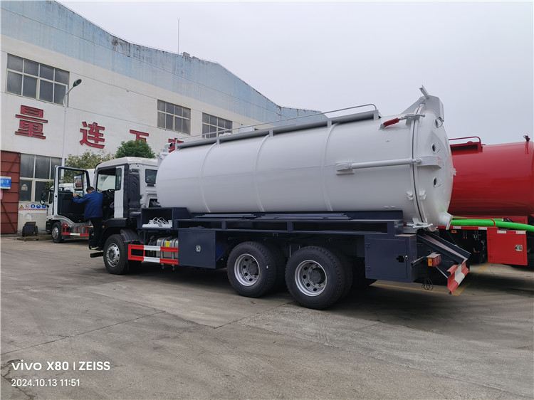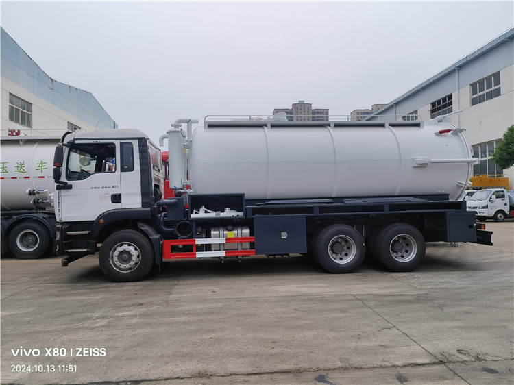 吸污罐:一個散水罐口,罐內帶爬梯,罐體內部用防浪板加固,水循環泵水箱為碳鋼材質,副駕一側為DN150鋁合金球閥,吸污罐尾部裝有DN600排污口,尾部左側一個DN150排污口,右側一個DN100的進料口,一個DN100鋁合金排污口,側邊一個DN100排清水,罐體尾部兩側工具箱,1根10米吸污管,箭頭燈,手動油門。
