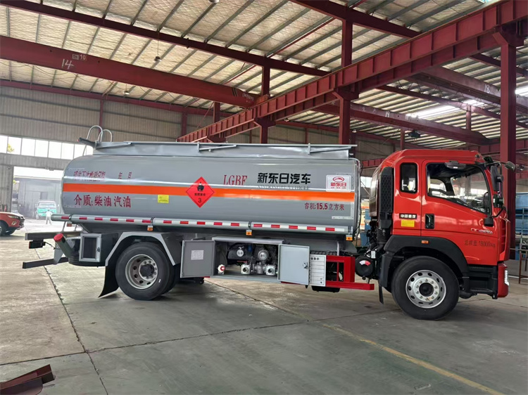 罐體采用優(yōu)質(zhì)碳鋼制作,單倉帶泵(泵可自吸自排),一個歐標罐口,兩個呼吸閥,一個緊急切斷裝置,一個油氣回收裝置,一個防液流探桿,一個下裝油口。帶折疊升降護欄,一個工具箱,配一個防火帽,兩根與罐體等長的輸油管,兩個滅火器,其余廠內(nèi)標配。保證罐體及整車外形尺寸按公告制作。