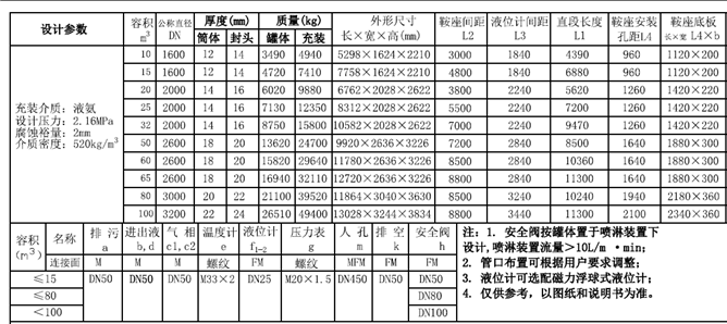 液氨儲罐按標準要求采用Q345R材質生產,結構主要包括筒體、封頭、人孔,鞍座,接管法蘭等,產品由特檢院檢驗,合格后頒發(fā)合格證,出具全套圖紙、技術資料。根據(jù)客戶的需要,我公司制定一個液氨儲罐規(guī)格型號表,容積從10立方至100立方均可提供,方便您需要時選擇。