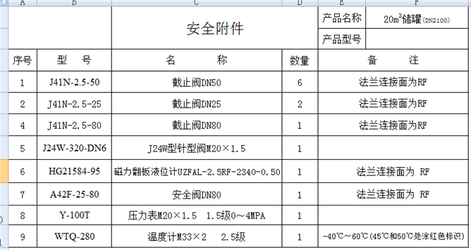 20立方液化氣儲罐是一種大眾的規格,國內很多地方如江西好多液化氣站就是搭配2個20立方液化氣儲罐和1個5立方的小罐裝殘液,安全附件沒有儲罐的使用壽命長,經常要更換,以下為按直徑2100mm的標準配置制定的20方儲罐安全附件清單,供您參考。