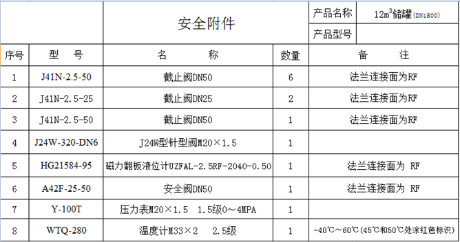 安全附件的型號與罐體上接管的尺寸相關(guān),12立方液化氣儲罐通常設(shè)計成直徑1800mm,液相與氣相接口均為DN50,溫度計和壓力表均采用螺紋式,以下為其安全附件清單: