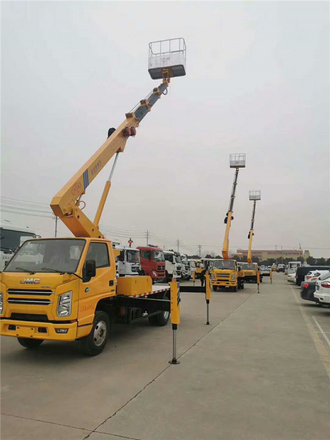 此車采用江鈴順達國六單排底盤,原裝空調,方向助力,四節(三節)五邊形伸縮臂,最大作業幅度10.5m;最大作業高度:20.8m(17.5米);最大作業高度時的作業幅度5m,360°全回轉。前Ⅴ后H型支腿,前支腿橫向跨距(mm)4500;縱向跨距(mm)4000;吊藍額定載荷≤200㎏。鋁合金吊藍尺寸:1400x700x1150,靜液調平,帶油缸鎖止功能,手動和百米遙控操作,帶應急動力單元,吊籃360度旋轉,自動調平。
