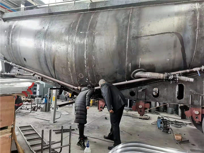 據(jù)悉,客戶用此車運(yùn)輸糧食等顆粒物,采用碳鋼材質(zhì)制作,設(shè)計(jì)壓力為0.3MPa,設(shè)計(jì)溫度為常溫,筒體厚度5mm,封頭厚度6mm,罐體分為四倉,工作原理采用重力氣卸式,配備空壓機(jī)、管線、閥門等設(shè)備,水壓和氣密均通過調(diào)試,回去之后直接可以使用。