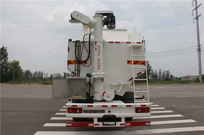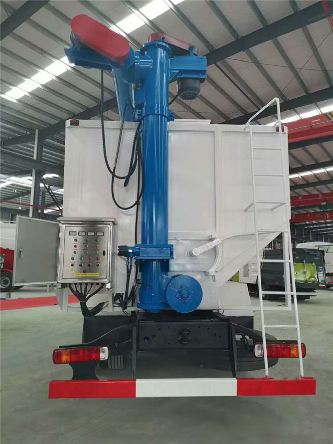 飼料車罐體材質采用國標4mm厚優質碳鋼板制作,整車3條絞龍,由3個5.5KW電機帶動,頂部絞龍用液壓控制舉升,可左右旋轉180°。罐體分4倉,可根據用戶要求做多個獨立分倉,可以獨立控制各分倉卸料順序和速度。