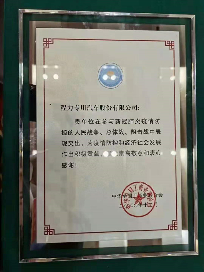 近日,在全國工商聯召開的執委會上,程力專用汽車公司榮獲全國100家抗疫先進民營企業的榮譽稱號。